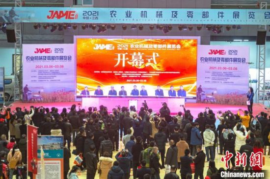 3月6日,江西南昌,2021中部(江西)农业机械及零部件展览会开幕式现场,参会领导和嘉宾共同宣布本次展会正式开幕。刘力鑫 摄