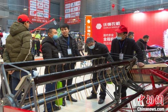 3月6日,江西南昌,2021中部(江西)农业机械及零部件展览会现场,观众正在向参展商了解展出的设备。刘力鑫 摄